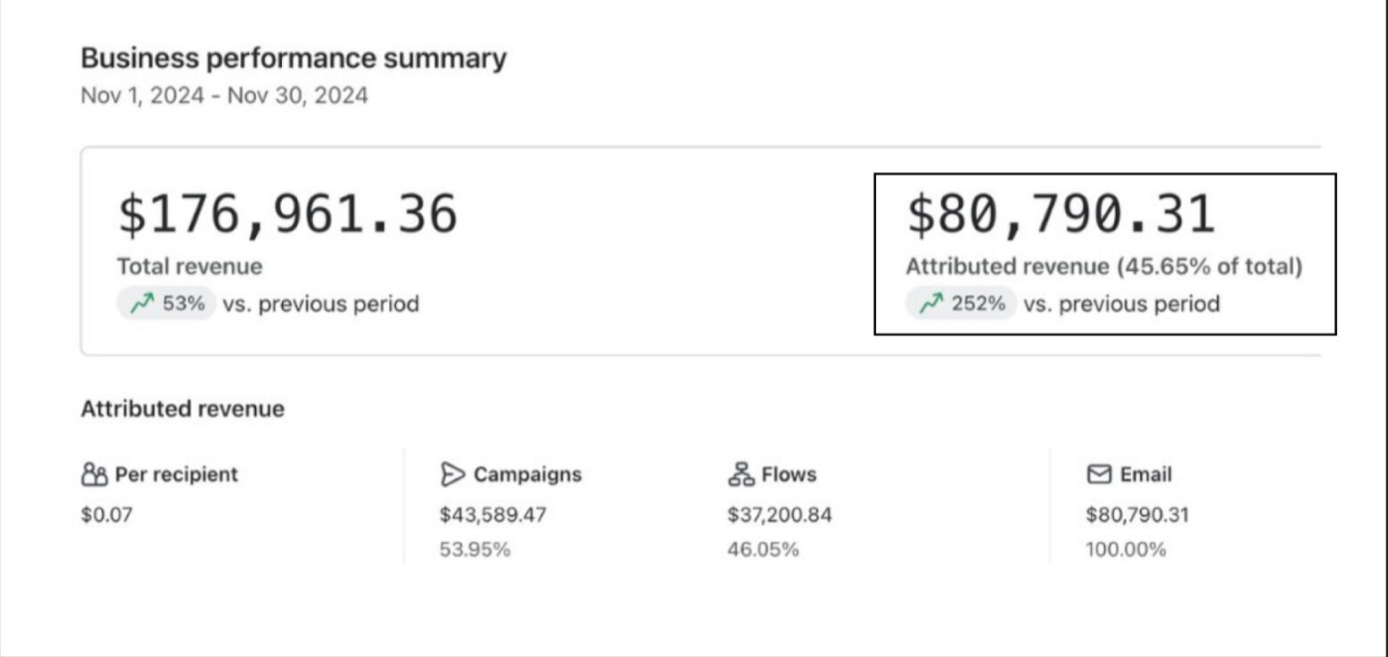 Before breaking down the system itself, it’s important to understand what becomes possible once your email backend is actually built the right way.The examples below aren’t cherry-picked or theoretical. They illustrate what ecommerce brands can achieve when email is structured correctly.These aren’t my results: I’m using them to illustrate what ecommerce brands can achieve with a strong email system.